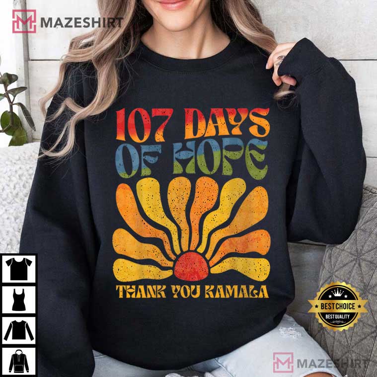 Want to brighten up your closet with a feminist T-shirt that makes you giggle and gives you hope? The “107 Days of Hope Thank You Kamala Floral Political Feminist T-Shirt” is here to shine! This Kamala Harris tee isn’t just a shirt; it’s a bright thank-you to a trailblazer wrapped in a beautiful floral pattern.