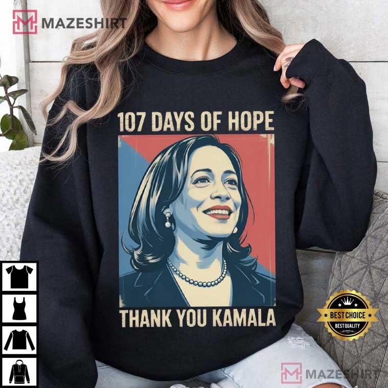 Would you like a political supporter T-shirt that is bright, witty, and a little bit hilarious? You need the “107 Days Of Hope Thank You Kamala Political Message Supporter T-Shirt” to show your support.