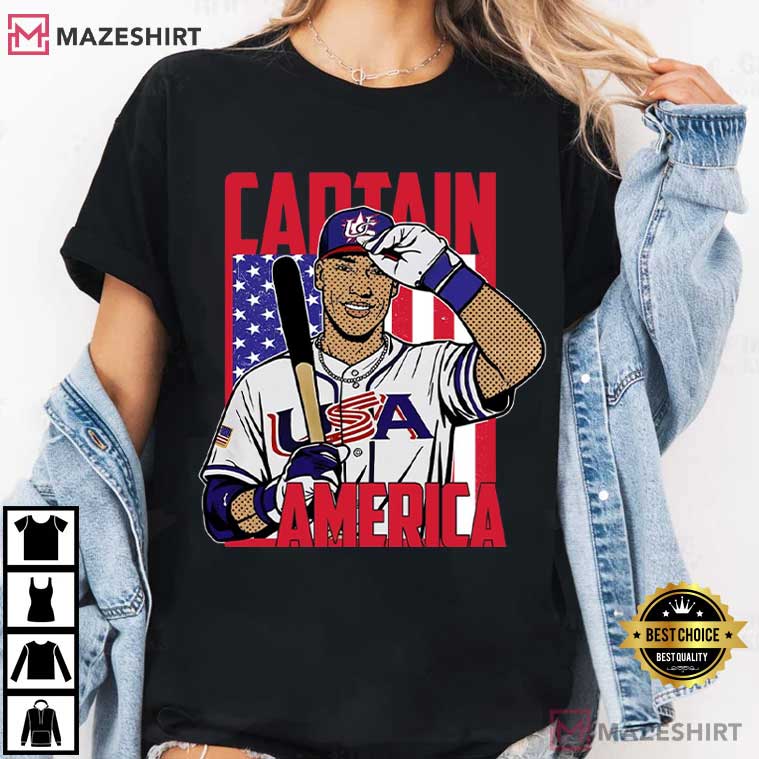 The shirt has the bold slogan “Captain America” over the design. It captures both the patriotic pride of international baseball and the imposing presence that Judge brings to the field.