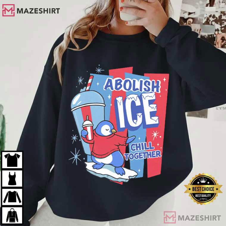 The design looks fun at first: a penguin with a big icy drink on its back stands on melting ice with the words “Abolish ICE – Chill Together.” But if you look a little closer, the meaning becomes evident. This shirt talks about a serious issue—immigration justice and opposition to draconian enforcement systems—using sarcasm and warmth without losing its human touch.