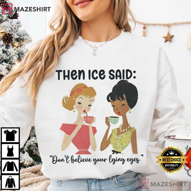 The Abolish ICE Social Justice Activist Protest T-Shirt gets its point across with a sweet grin and a sharp edge. Under the sentence “Then ICE said:” and the sharp answer “Don’t believe your lying eyes,” there are two retro-style women sharing coffee in warm mid-century colors. It looks soft, makes you think of the past, and is clearly critical.