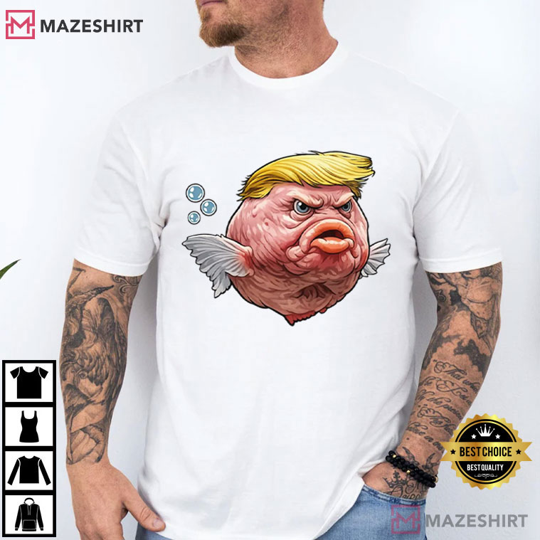 The Angry Fish Anti-Trump Parody Political Satire T-Shirt is a cartoon-style pufferfish with an exaggerated pout, a serious look, and a golden haircut that stands out. Bubbles that float and little wings give the picture a strange twist, mixing fun with parody art.