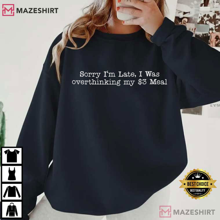 The shirt says, “Sorry I’m late, I was overthinking my $3 meal,” which sounds casual at first. But for a lot of individuals, it hurts more. It shows how hard it is to make decisions when you’re under a lot of stress and trying to get by with big political and societal influences in the background.
