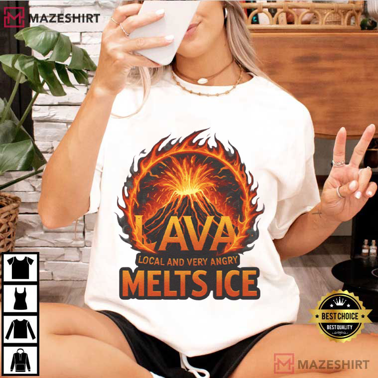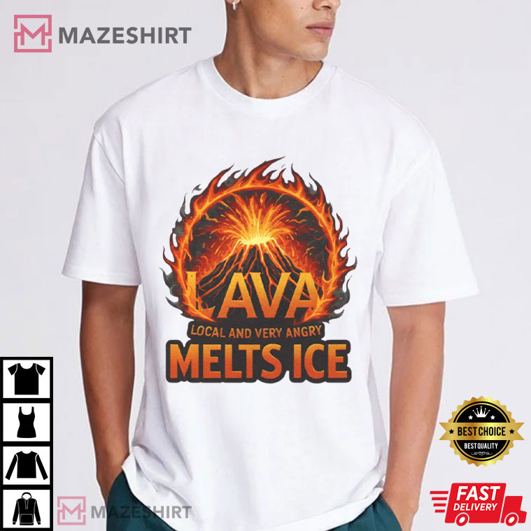 This Anti ICE Lava Melts Graphic T-Shirt has a bold statement and a dramatic picture of a volcanic eruption.