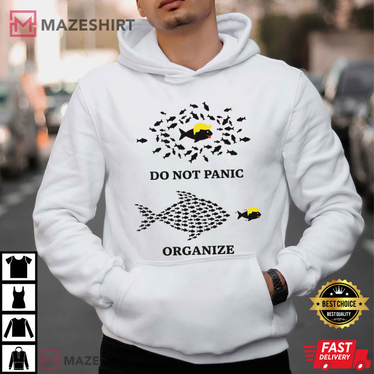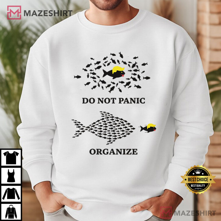 The design has a smart fish picture and the strong message “Do Not Panic—Organize” that encourages people to come together and take action when things get tense politically.
