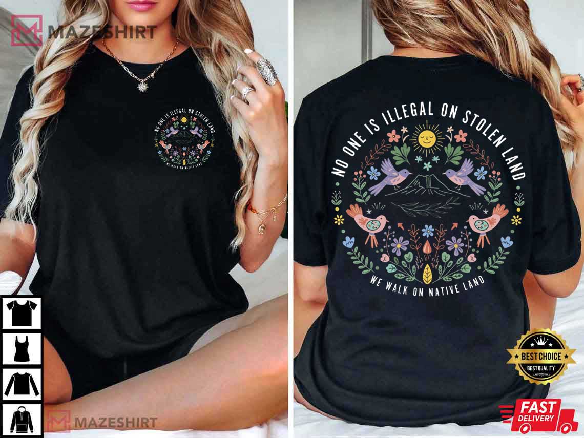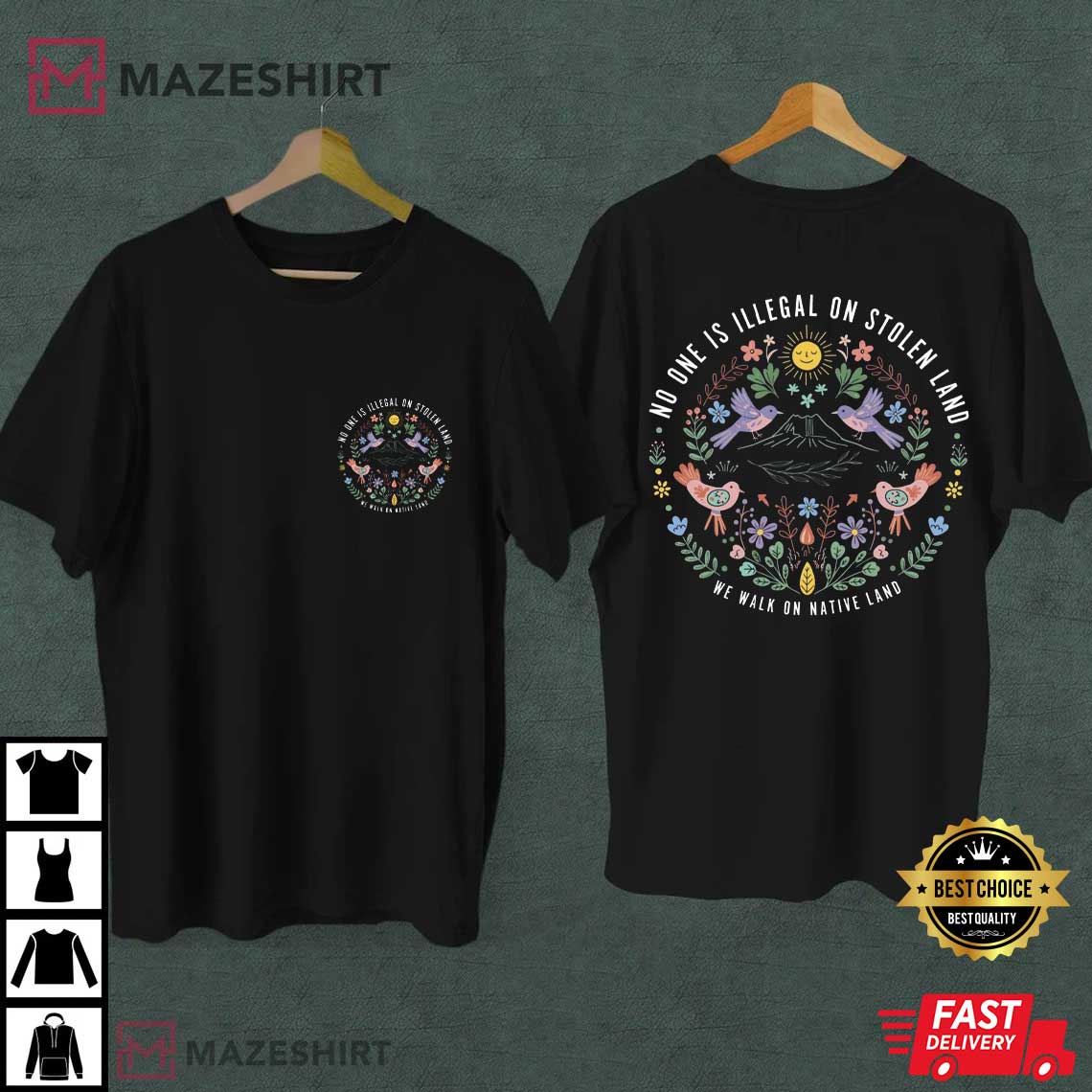Want to make a statement that is both beautiful and bold? The Anti Trump No One Is Illegal On Stolen Land Native American T-Shirt is here to blend activism with a touch of humor! This striking black tee has a bright graphic of birds, flowers, and mountains, along with a forceful message: “No One Is Illegal On Stolen Land.” This shirt is great for anyone that support Native Americans, don’t like Trump, or just want to give a unique present. It gets people talking and makes them laugh. Get one today and show off your ideals with pride!
