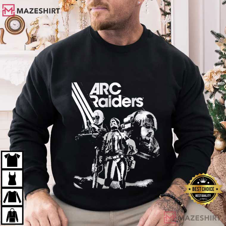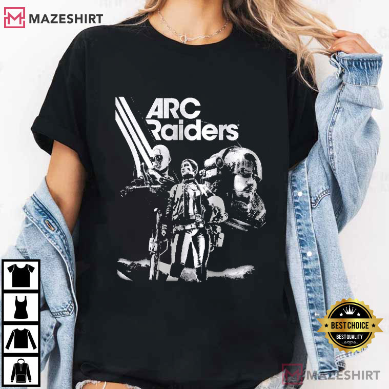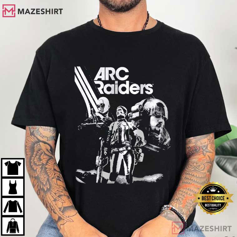 The Arc Raiders Bleached Ink Acid Wash Gamer Survival T-Shirt perfectly conveys the raw tension and drive that are at the heart of modern sci-fi survival games. The design has a stark black-and-white background with highly armed raiders standing in front of huge mechanical dangers. The strong ARC RAIDERS typeface cuts through the scene. The distressed, high-contrast style makes it look like it’s been worn in and is ready for war, which goes nicely with an acid-wash effect.