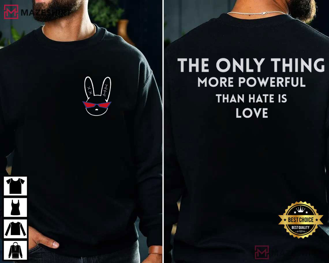 The Bad Bunny Bowl The Only Thing More Powerful Than Hate Is Love T-Shirt combines a simple design with a strong message based on unity, strength, and pride in one’s culture. This composition is inspired by the excitement of big stadium events and the impact of Latin performers on the world stage. It keeps things simple and lets the message do the work.