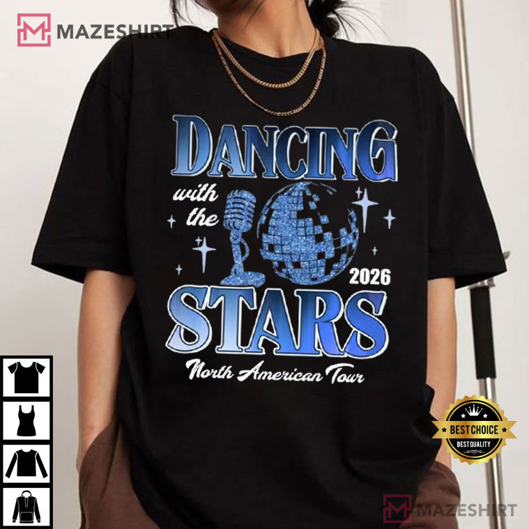 This Ballroom Dancing With The Stars Tour 2026 Dance Show T-Shirt has everything fans love about the show, such the music, the sparkly lights, and the electrifying intensity of the performance. The design has a shiny blue disco ball, an old-fashioned microphone, and bold headline text that makes you think of the glitz and glam of live tour performances and ballroom nights.