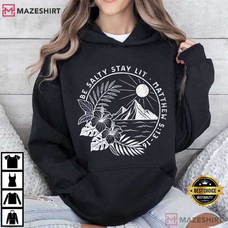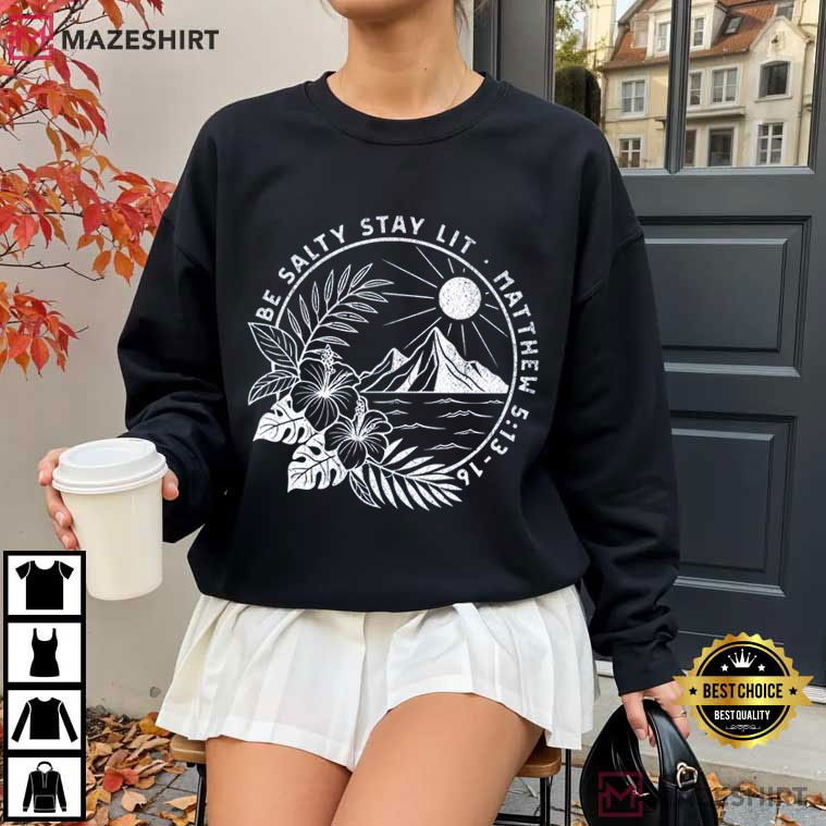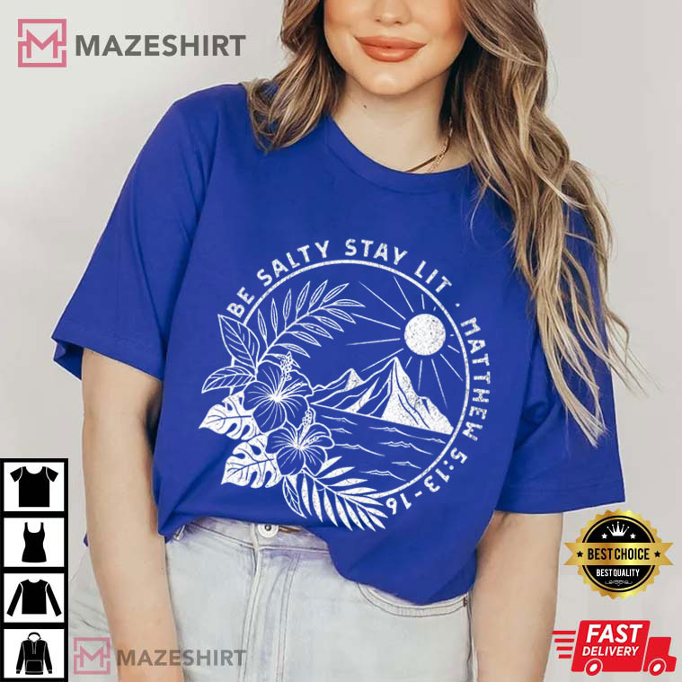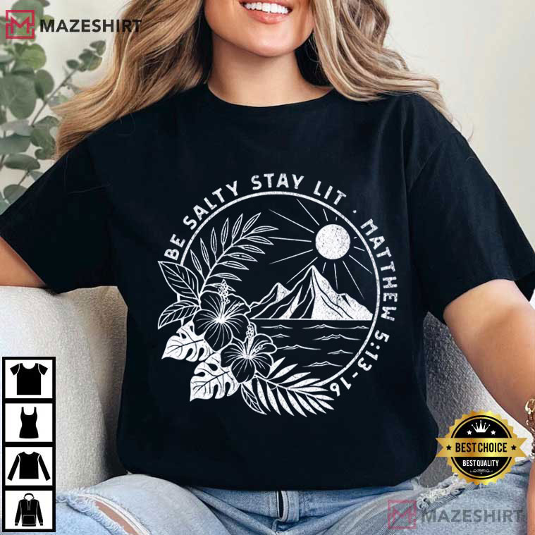 The Be Salty Stay Lit Christian T-Shirt makes the Bible come to life in a new and modern way. This shirt design is based on Matthew 5:13–16 and combines bold faith with bright coastal images to provide a shirt that is fashionable, uplifting, and very meaningful.