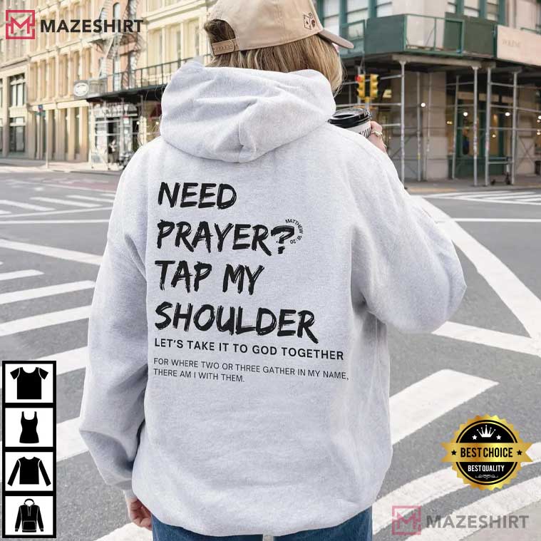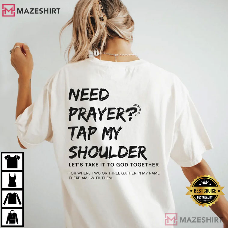 The striking back graphic of the Need Prayer Tap My Shoulder Christian T-Shirt says: