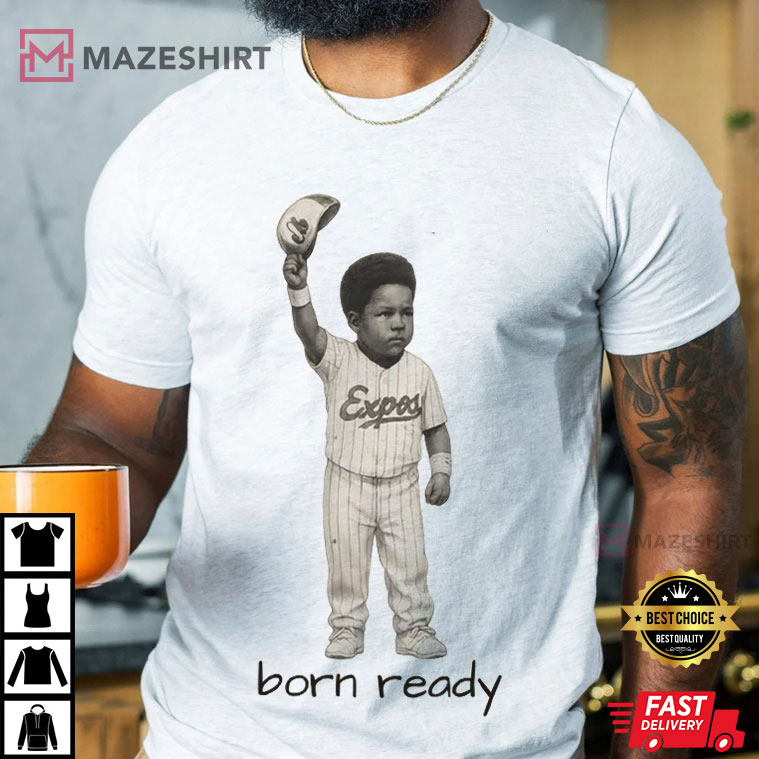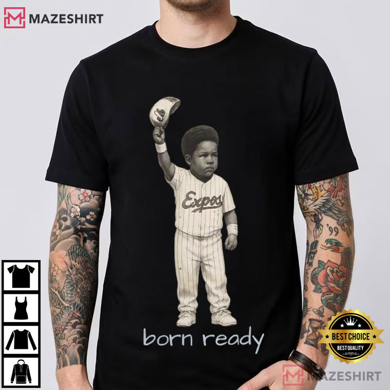 The main part of this design is a retro-style picture of a young Vladimir Guerrero Jr. in a classic Expos outfit, raising his cap with serene confidence. The expression “born ready” binds everything together by implying that talent, legacy, and enthusiasm were all there from the start.
