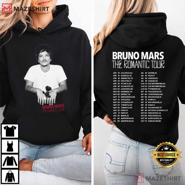 The shirt has a simple black-and-white design with bold tour text. It shows off Bruno Mars’s ageless charm and stage presence, which have made him a global star.