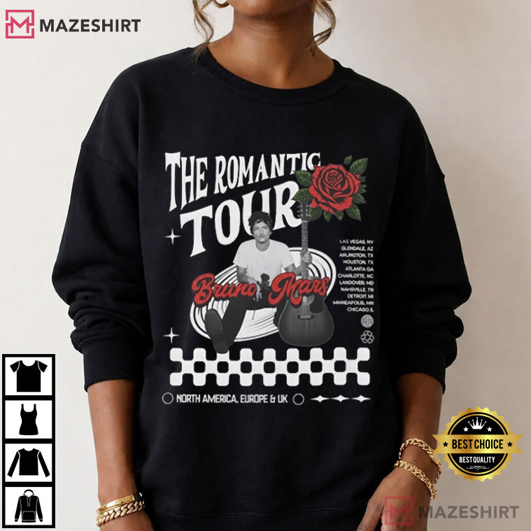 Bruno Mars The Romantic Tour 2026 Fan Merch T-Shirt is a cool way to remember one of the most charming singers in current music and R&B. This shirt is for fans who adore the classic sound and stage presence of Bruno Mars. It features a romantic, retro-inspired vibe that has been a big part of his songs and live shows.