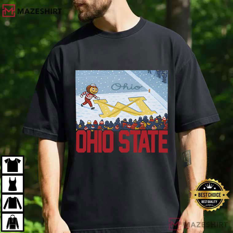 A Brutus Ohio State Snow Fan Football T-Shirt that wonderfully combines rivalry humor, winter moods, and classic Buckeye spirit is a great way to show your Ohio State enthusiasm. Brutus Buckeye is happily sprinting across a snowy field on this tee, leaving a big “W” buried under his tracks. This is a fun dig at one of Ohio State’s biggest rivals. The artwork gives off the warm, electrifying spirit of a late-season football game, with spectators cheering in the stands and snow falling all around.