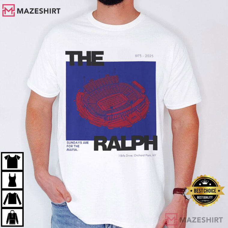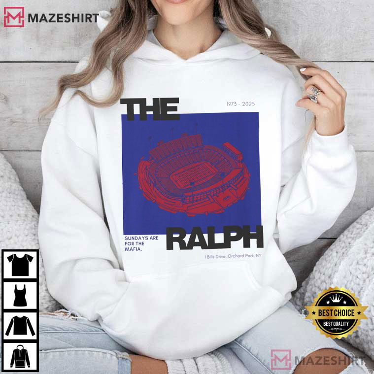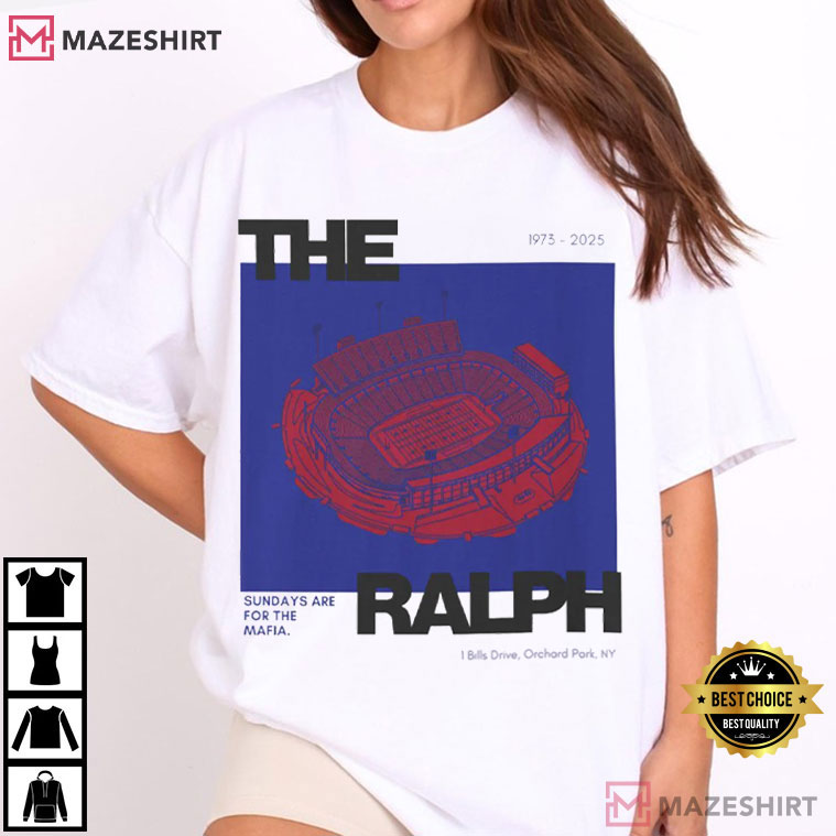 The shirt has a simple drawing of Highmark Stadium (Orchard Park, NY) in vivid red and blue colors that are readily linked to Buffalo football tradition. The typeface “THE RALPH” is a nostalgic tribute to what long-time fans still call the stadium, even if the name changes with time.