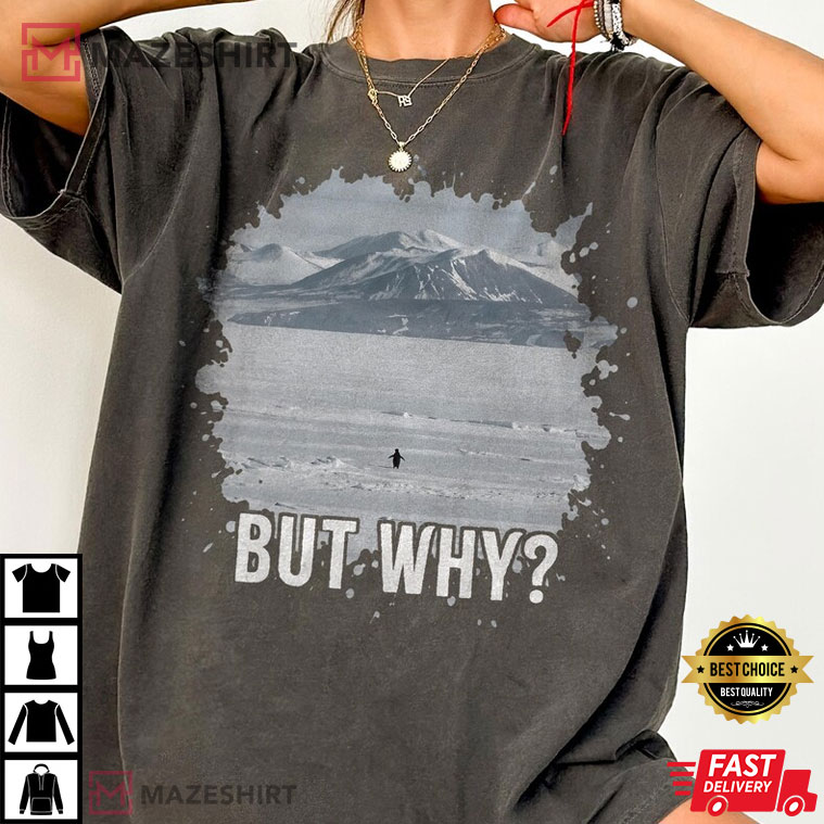 The But Why Penguin Viral Meme Comfort Colors T-Shirt takes a simple picture and makes it into a big, shared sensation. The design shows a lone penguin standing in a vast, icy landscape, dwarfed by mountains and snow, with the simple words “BUT WHY?” stamped underneath. It’s simple, cinematic, and easy to relate to—one of those memes that conveys everything without going into detail.