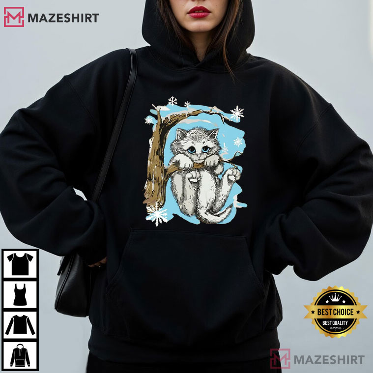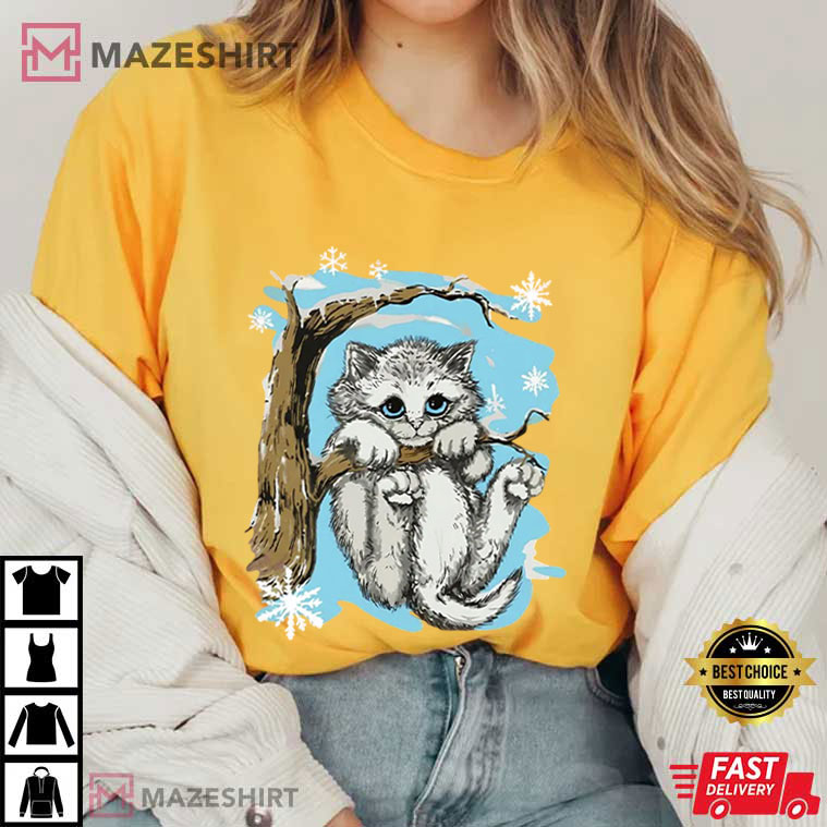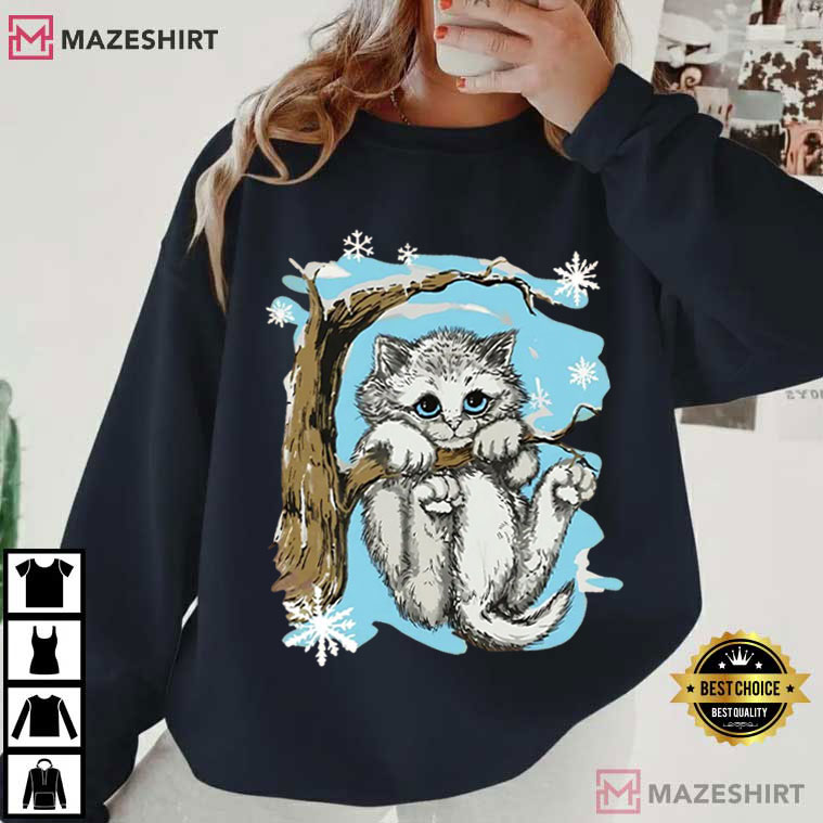 In the middle of the design is a cute, fluffy kitten dangling on a tree branch with wide eyes and a hint of mischief. Snowflakes are falling around it in a calm blue winter sky. This is the kind of image you would have seen on a vintage mall tee in the late 1990s. It’s lovely, a little dramatic, and completely delightful.