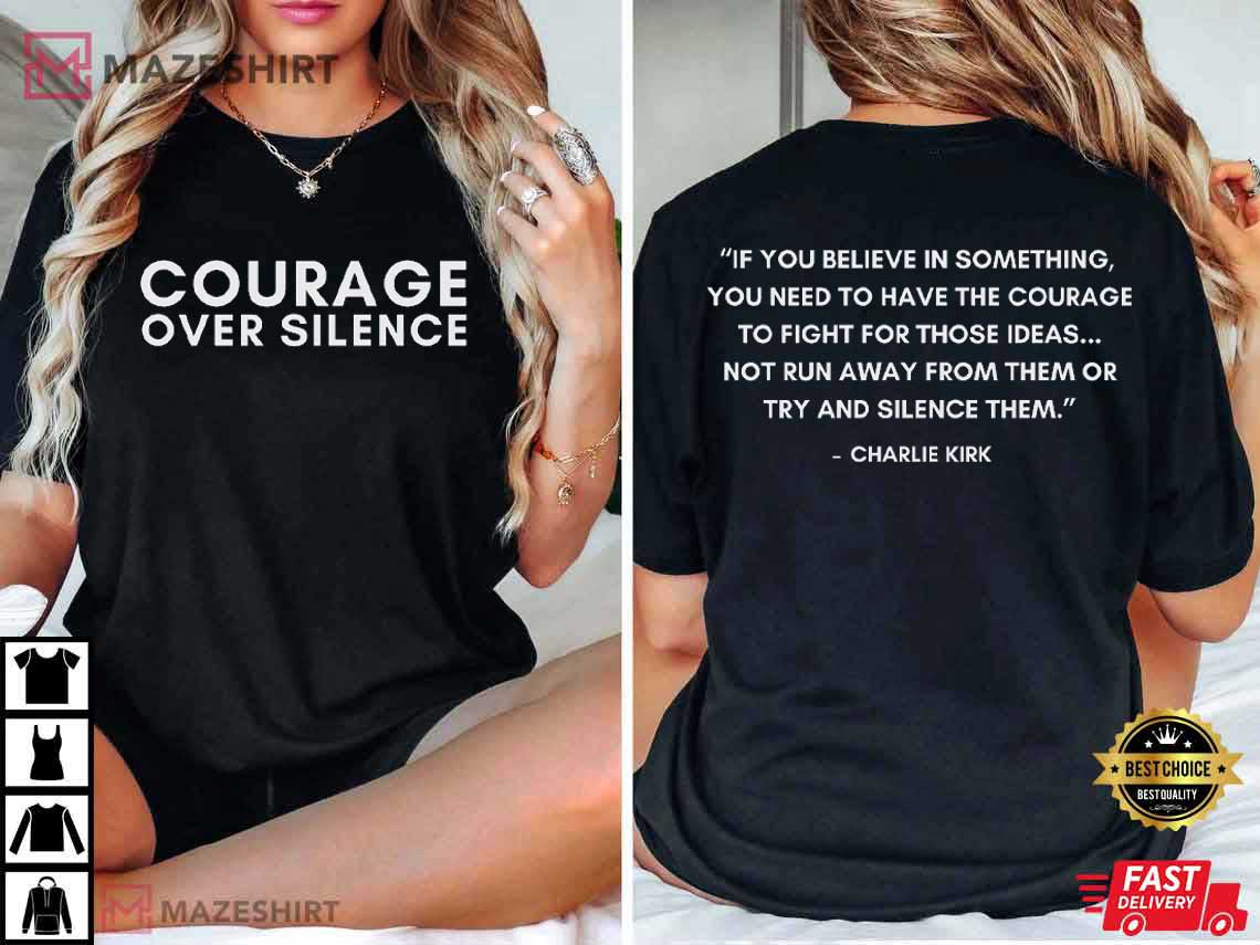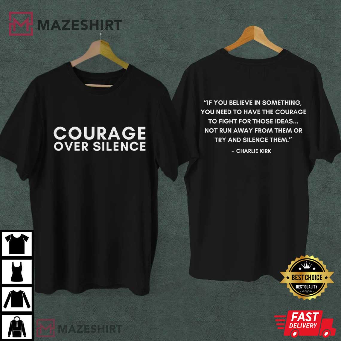 Some shirts are only made of fabric and thread. Some are a declaration, a belief, or a call to arms. The Charlie Kirk Courage Over Silence T-Shirt is definitely one of the latter. This shirt is for people who believe in free speech, standing up for what they believe in, and having the courage to speak up. It has “Courage Over Silence” in big white lettering across the chest and a quotation from Charlie Kirk on the reverse that makes you think.