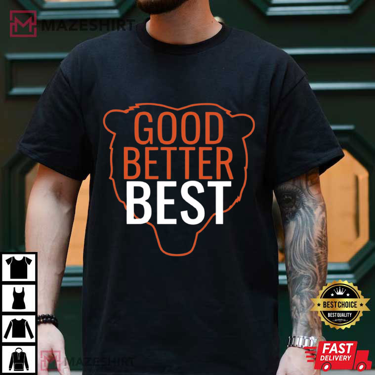 Some designs don’t need a big logo or a mascot to stand out. The phrase “GOOD BETTER BEST” is written inside an outline of a bear’s head, which is a subliminal reference to Chicago’s favorite NFL team. The orange and white writing stands out against the Chicago Bears Good Better Best Football Fans T-Shirt, giving it that typical Bears color vibrancy without being too much.