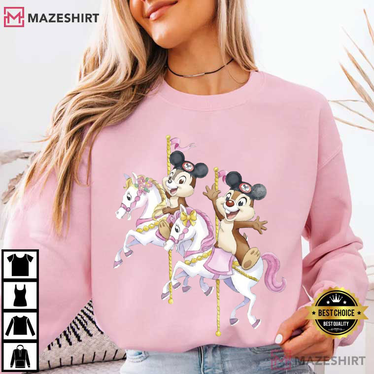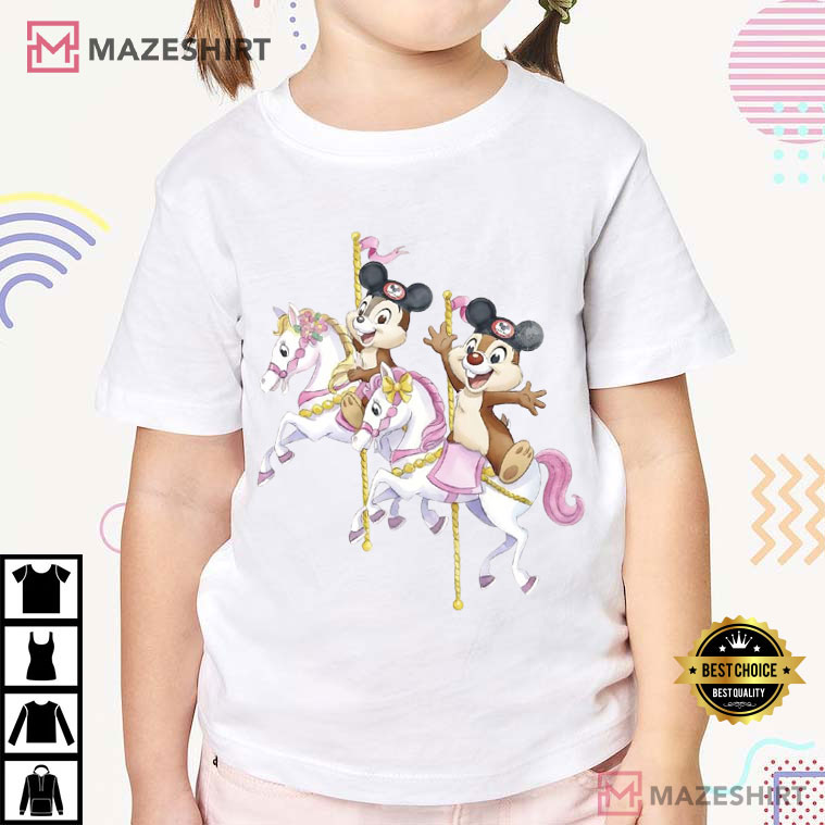 The Chip and Dale Carousel Funny Disney T-Shirt is a delightful design that will make you happy. This shirt is inspired by the famous Disney park vibe. It features Chip and Dale riding carousel horses with large smiles and lots of happy energy.