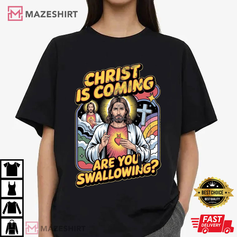 Christ Is Coming Are You Swallowing Funny Jesus Meme T-Shirt – graphic tees men, graphic tees women, unique graphic t shirts