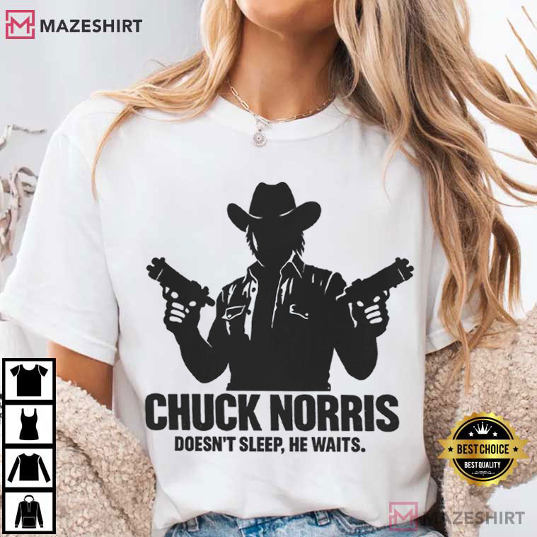 Some designs don’t simply look amazing; they also tell a narrative. The Chuck Norris Cowboy Silhouette Funny Quote Meme T-Shirt has a clean, powerful graphic that mixes humor, nostalgia, and sheer action-hero spirit into one that captures attention right away.