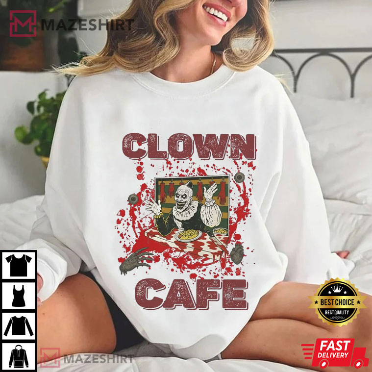 Hey, people who love horror and Halloween! Have you ever experienced that nightmare when you want a late-night snack, but the diner is managed by a clown that is hungry for blood and has spaghetti all over the place? If that sounds familiar, or more like a spooky carnival song, then the Clown Cafe T-Shirt is your way to show off your fear.