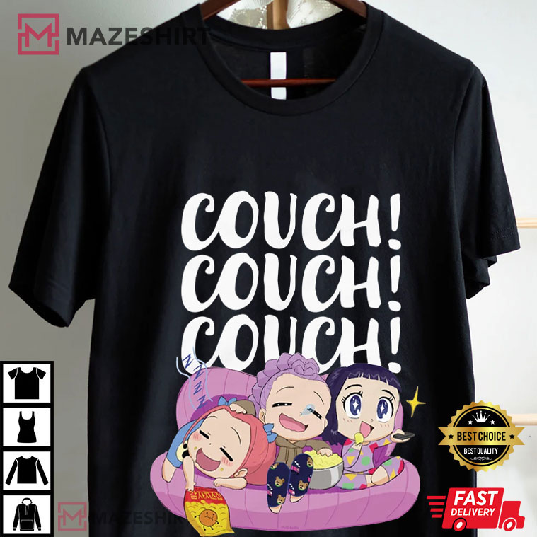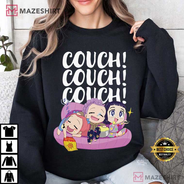 Hey, K-pop fans and anyone who like to binge-watch! If you’ve ever been hooked to the couch with munchies in hand, yelling at the television during an epic demon-slaying sequence, then be ready to love the Couch Couch Couch Anime Style Huntrix Kpop Demon Hunters T-Shirt. This black tee depicts the ultimate moment of utter lethargy from the hit Netflix animated show “KPop Demon Hunters.” In it, the strong female group Huntrix—Mira, Zoey, and Rumi—trades their demon-hunting gear for pajamas and a soft couch.
