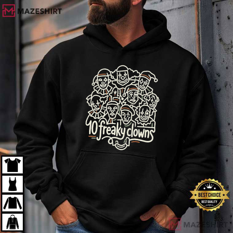 The “10 Freaky Clowns” graphic t-shirt with the creepy clown on it is dark, weird, and hard to miss. It’s for people who prefer dark comedy, underground art, and a little bit of chaos. This design has a bold, memorable look that will make you stand out, whether you like horror or not.