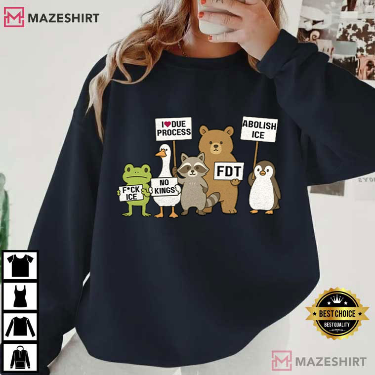 The Defund ICE Animals Protest Equal Rights T-Shirt sends a strong message with humor and love. A line of friendly cartoon animals—frog, duck, raccoon, bear, and penguin—stands shoulder to shoulder across the chest, each holding a placard that says “protest.” The style is meant to be soft and friendly, which makes the message hit even harder: compassion, due process, and equal rights are important.