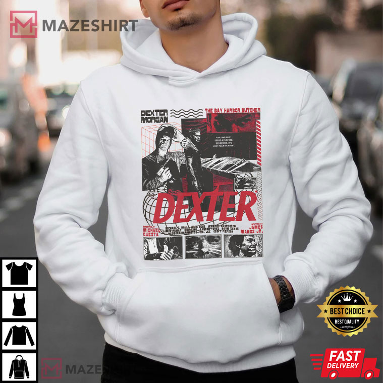 Fans of dark riddles, psychological strain, and the great stories behind one of TV’s most famous crime-thriller characters will adore this Dexter Morgan Vintage Crime Thriller Graphic T-Shirt. The design is inspired by old crime magazine covers and has a collage-style layout with gritty textures, strong red writing, and black-and-white stills that show the essence of Dexter’s double existence.