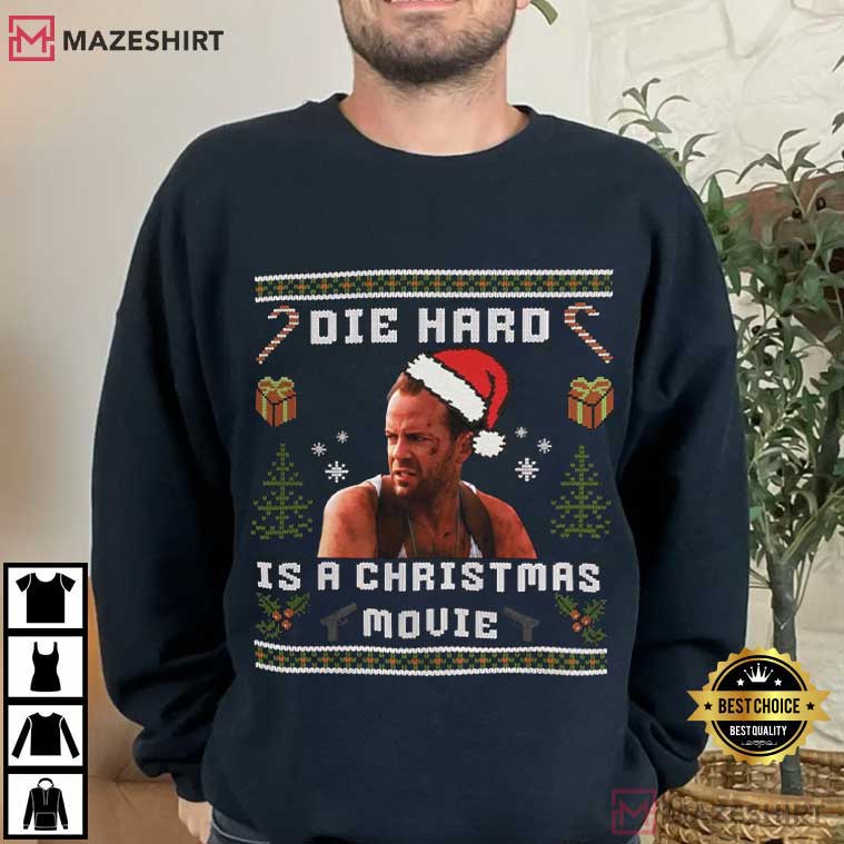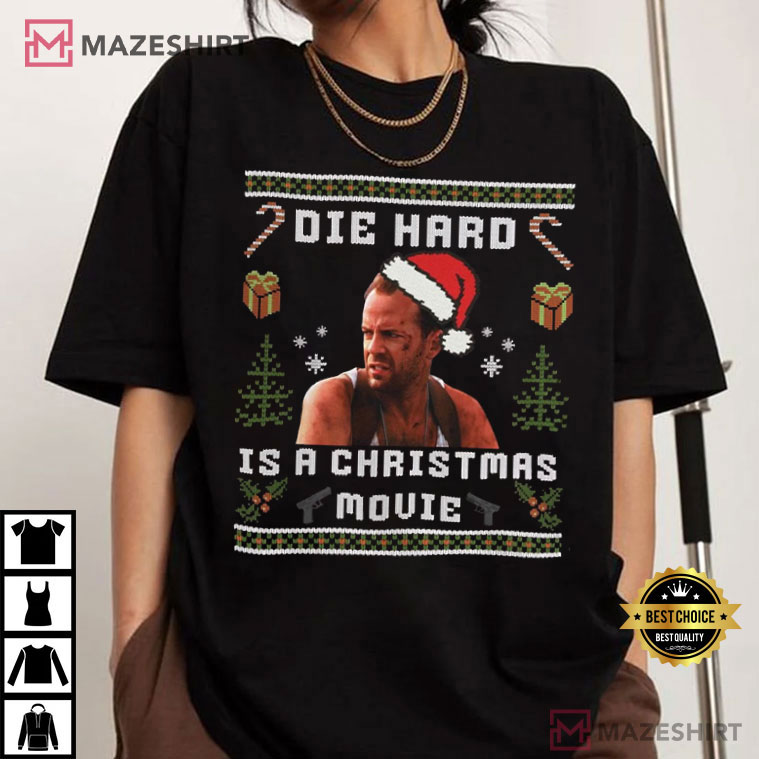 This Die Hard Is A Christmas Movie Ugly Sweater T-Shirt has a fun holiday theme with the excitement of an action movie all in one shirt. The graphic looks like an old-fashioned ugly Christmas sweater and has pixel-knit effects, candy canes, gift boxes, snowflakes, Christmas trees, and a picture of the movie’s famous action hero donning a Santa cap in the middle for a funny touch.