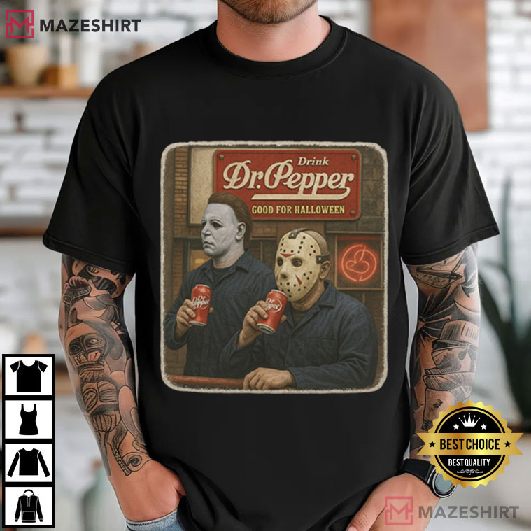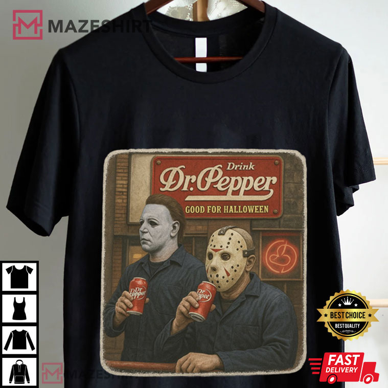 Michael Myers from John Carpenter’s Halloween series and Jason Voorhees from Friday the 13th are the main characters on this tee. Both are famous slasher villains who usually scare people with knives, machetes, and an eerie stillness. But here, they’re relaxing together, drinking Dr. Pepper like old friends on a Halloween night off.