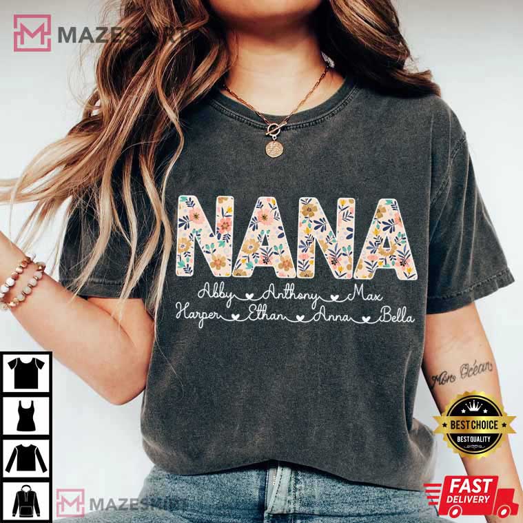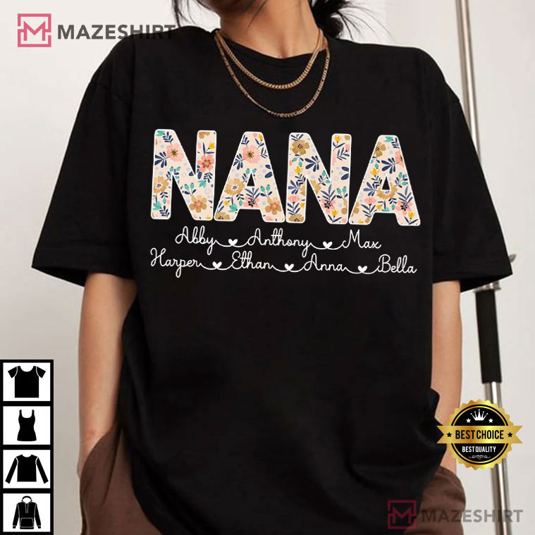 Floral Nana Custom With Grandkids Names Mothers Day T-Shirt