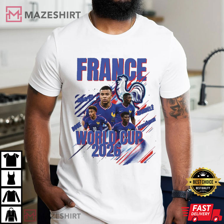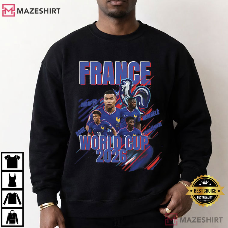 The France World Cup 2026 Kylian Mbappé Football T-Shirt shows how exciting international football can be when it’s at its best. This shirt is for folks who love all kinds of games. It has a strong image that mixes national pride, star power, and excitement for the game.