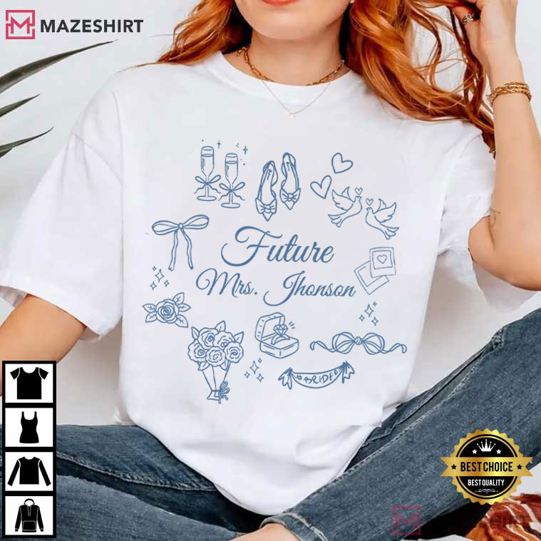 The design is based on fine script lettering that says “Future Mrs. [Custom Name].” It is accompanied by delicate images of wedding themes that tie the whole story together.