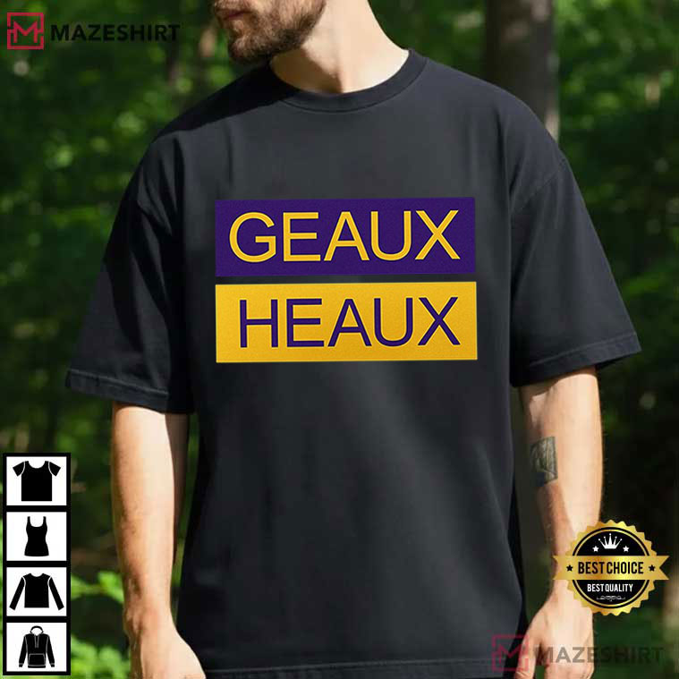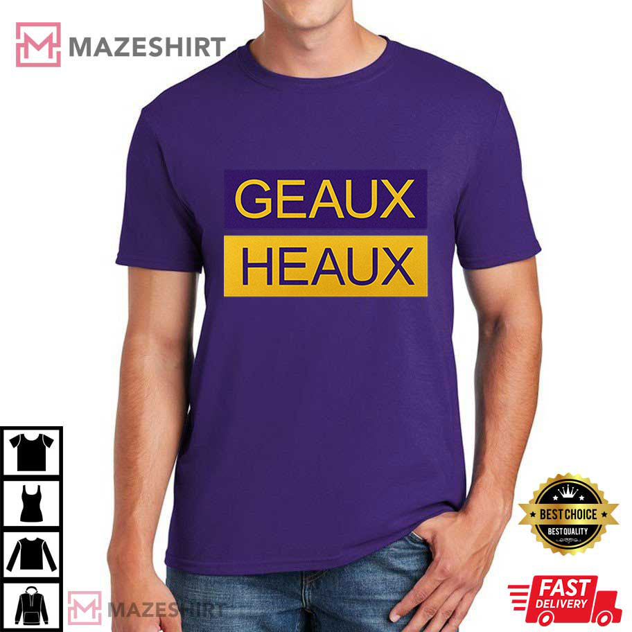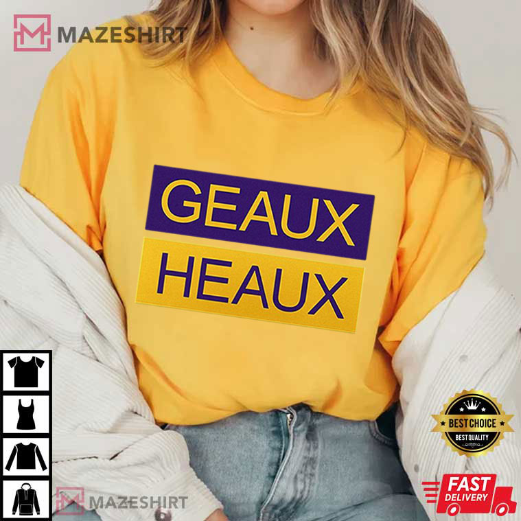 There are two neat, blocky panels on the shirt: purple on top and gold on the bottom. Each one has the fun chant “GEAUX HEAUX” on it. It’s a cheeky take on LSU’s famous “Geaux Tigers” cheer, along with the funny name that LSU fans use to talk about Lane Kiffin during heated games and online conversations.
