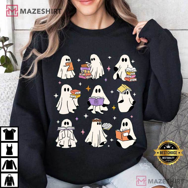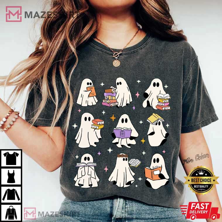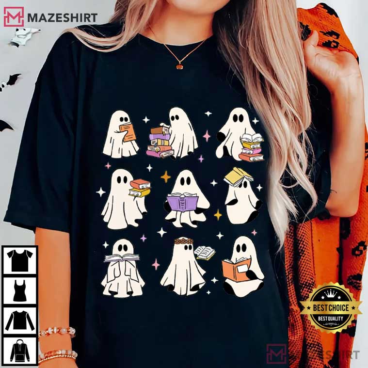 Ghost Reading Books Bookish Halloween Teacher Librarian T-Shirt – halloween themed shirts