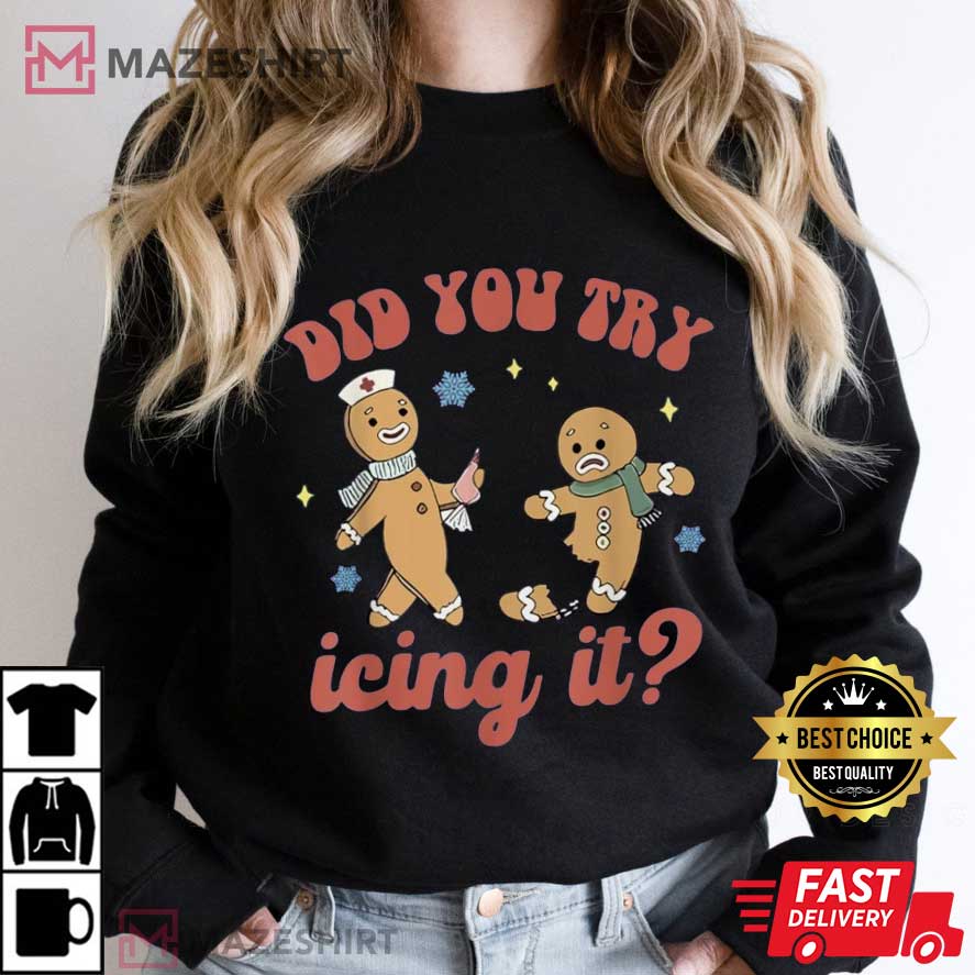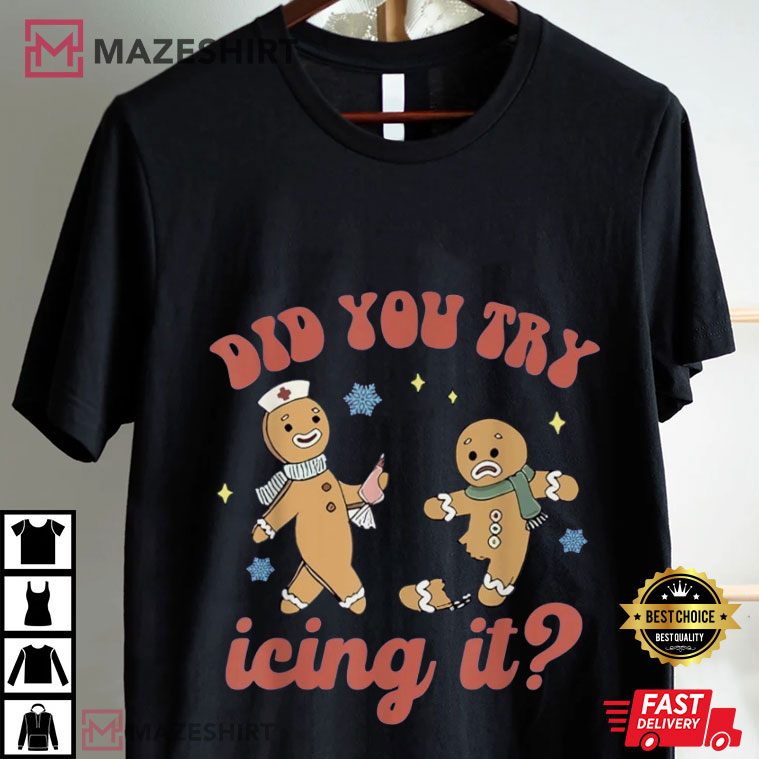 The Gingerbread Did You Try Icing It Funny Christmas T-Shirt is your new holiday favorite. It’s a fun, cheeky shirt that marries the charm of a baker with a bit medical-humor sass. Imagine two gingerbread people: one is a nurse with a small cap on her head, and the other is a cookie with a lost leg (made of cookie, not drama). The nurse gingerbread has that famous “practical advice” look with her eyebrows lifted, and the caption underneath says, “Did you try icing it?” — a joke that makes you do a double take and is half about taking care of cookies and half about being funny at the bedside.