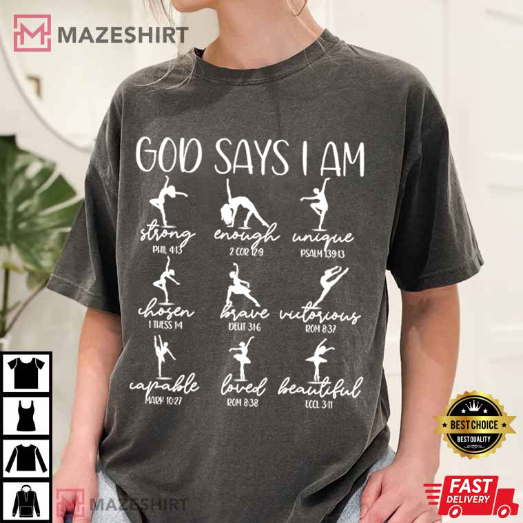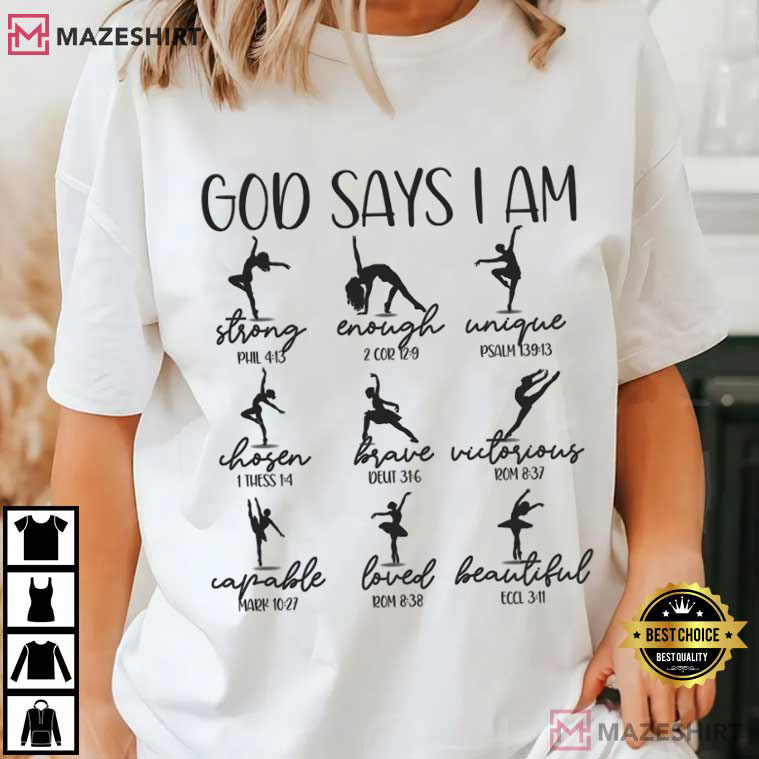 Good news if you’ve ever thought, “I wish I could wear my faith and love of ballet in one stylish package.” The God Says I Am Ballet Dance Bible Verse T-Shirt does just that. This isn’t simply another Christian shirt with a verse on it; it’s a carefully thought-out clothing that combines scripture, beautiful ballerina stances, and strong affirmations.