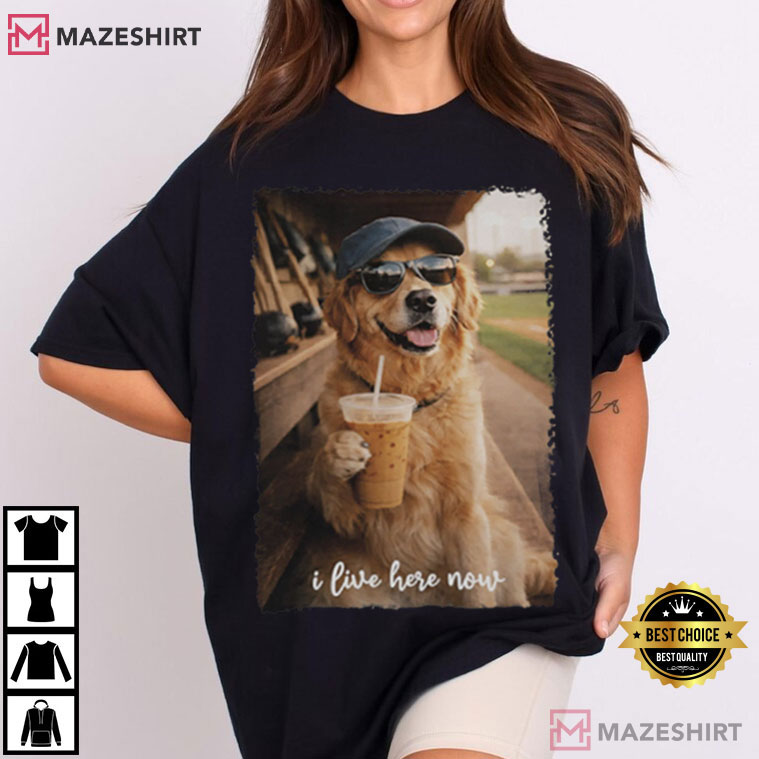 A golden retriever that is relaxed and drinking iced coffee like it owns the place is something that everyone can relate to right away. This design really represents that mood: relaxed, sure of yourself, and a little bit hilarious. The dog, who is wearing sunglasses and a cap and sipping a chilled drink, gives off a “I’ve claimed this spot” attitude that goes wonderfully with the message “I live here now.” It’s not only cute; it says something about you.