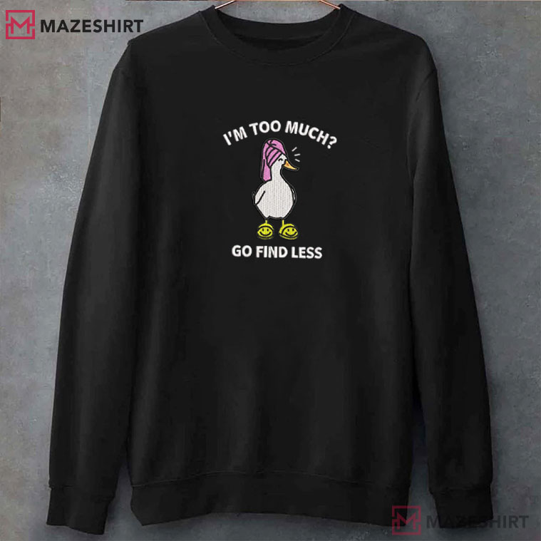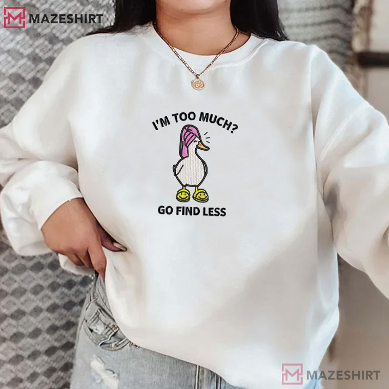 Goose I’m Too Much Go Find Less Humor Embroidered Sweatshirt custom embroidered sweatshirts, personalised embroidered sweatshirts, embroidered crewneck