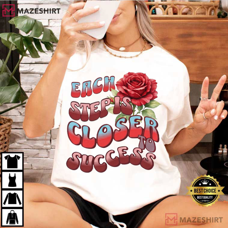 The sentence at the center of the design is: “Each Step Is Closer to Success” is written on a rose that is artistically drawn and stands for growth, strength, and becoming your best self.