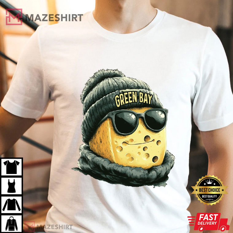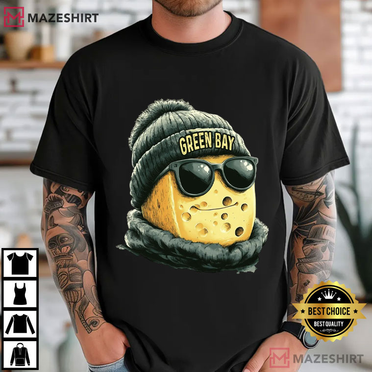 This isn’t just another football shirt; it’s a Green Bay Mascot Packer Graphic Cozy Game Day T-Shirt made for real Cheesehead Nation fans. The bold design has a block of Wisconsin cheese wearing sunglasses, a warm scarf, and a winter beanie with “GREEN BAY” sewn on the front. It’s the best mix of flair, humor, and die-hard fandom.