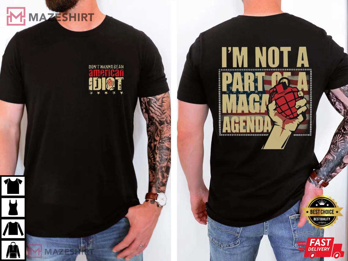 Are you ready to let out your inner punk rock rebel? The Green Day shirt with “Don’t Wanna Be An American Idiot” on it is here to make a statement—loudly! This sleek black tee has the famous feel of Green Day’s classic song, but with a funny take on today’s political scene and an anti-MAGA edge. This political t-shirt is made to stand out and is great for anyone that love music, think for themselves, or just want to have a good laugh. It has a raised fist and a grenade design, and it states, “I’m not buying the hype!” Get one today and show off your attitude with pride.