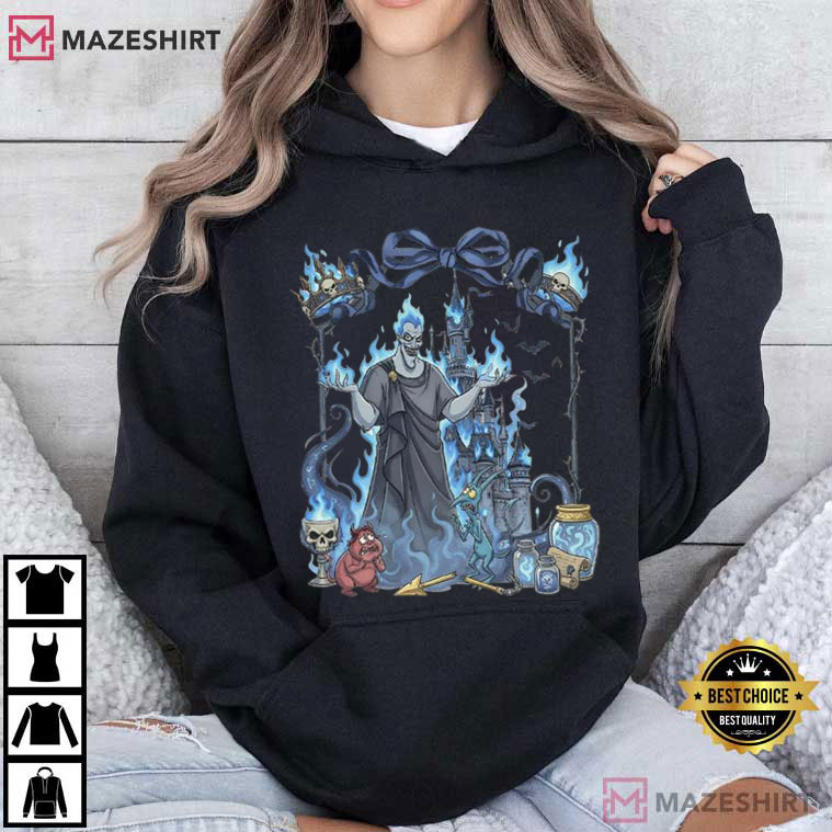 The main character is a villain with flaming hair who is based on the famous god of the Underworld from Hercules. He stands tall in front of a dark, magical castle, with electric blue flames all around him. At his feet are mischievous demon sidekicks, skull goblets, potion jars, arrows, and magical objects, all inside a fancy frame with a dramatic bow on top in the form of a coquette.