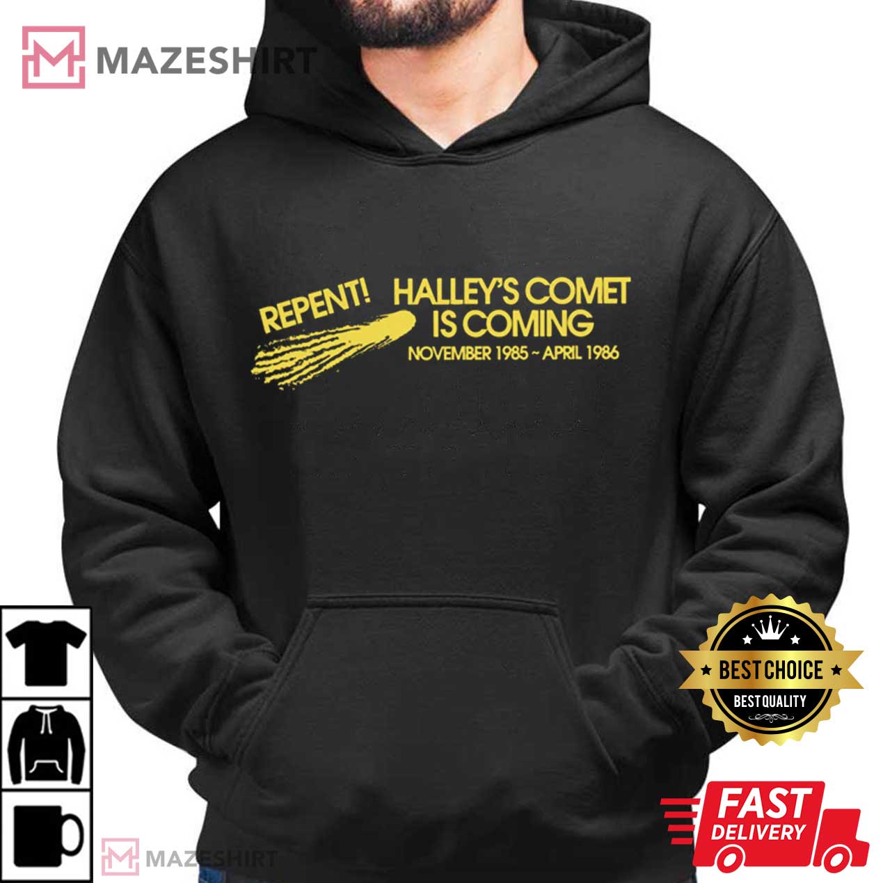 The Halley’s Comet Repent Sticker T-Shirt looks like it came from a dusty street corner in the 1980s or a flier that was pinned to a lamppost and then forgotten. The shirt has a rough comet streak, bold yellow letters, and a frank statement that give it a raw, retro energy that is both funny and weirdly prescient.