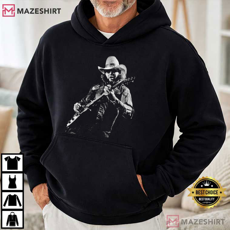 The Hank Williams Jr. Outlaw Country Vintage Graphic T-Shirt embodies the rough, rebellious attitude of outlaw country music. This design has a startling black-and-white picture of a cowboy-hatted guitarist in the middle of a performance. It captures the rough authenticity and larger-than-life presence of Hank Williams Jr.