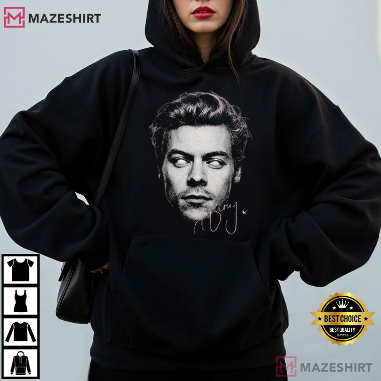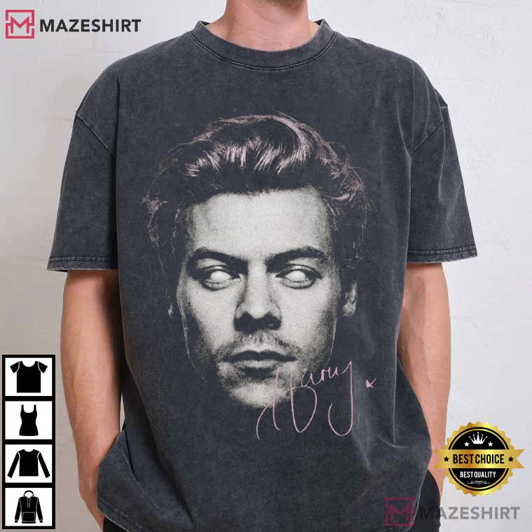 A dramatic black-and-white photo of Harry Styles, one of the most prominent style icons of our generation, is in the middle of the shirt.